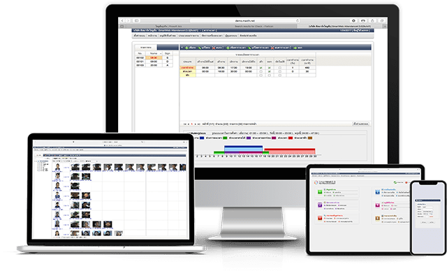 จัดการผู้ใช้ รายงานและเงื่อนไขการลงเวลาต่างๆผ่านโปรแกรมรูปแบบเว็บแอพพลิเคชั่นที่ให้คุณสามารถเรียกใช้งานผ่านอุปกรณ์ต่างๆผ่านเว็บบราวเซอร์ได้ทันที